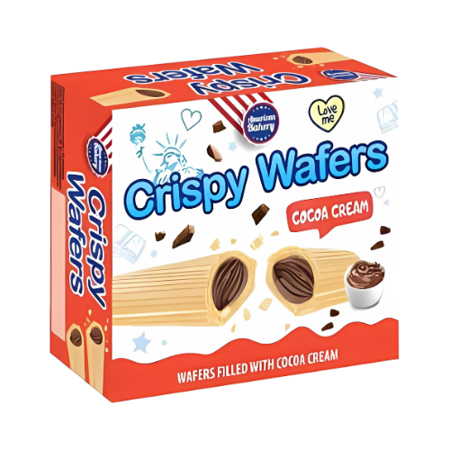 American Bakery Crispy Wafers Cocoa Cream bieten den perfekten Knuspergenuss: feine, mehrschichtige Waffeln, gefüllt mit einer cremigen Kakaofüllung. Ob als Snack zwischendurch, zum Kaffee oder Tee – diese Waffeln überzeugen mit ihrer Kombination aus leichter Textur und intensivem Schokoladengeschmack.