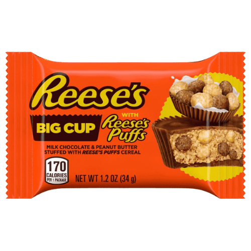 Der Reeses Big Cup Puffs bringt dir den beliebten Peanut-Butter-Geschmack in einer neuen, noch cremigeren Variante: Ein extra großer Schoko-Cup, gefüllt mit luftiger Erdnussbutter-Creme, die beim Reinbeißen zart auf der Zunge schmilzt. Perfekt für alle, die es besonders soft, schokoladig und intensiv lieben!