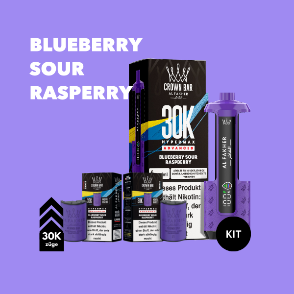 Mit dem 5x Al Fakher 30K Hypermax Akku + 2×5 Pods Blueberry Sour Raspberry genießt du volle Power und ein intensives Beerenaroma mit Sour-Effekt – ideal für alle Vape-Fans.